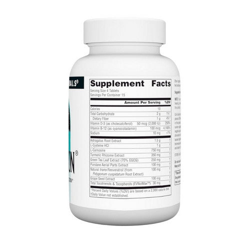 {"id":6869213806677,"title":"Source Naturals, Telomeron, 60 Tabs","handle":"telomeron-120845","description":"\u003cstrong\u003eProduct Description\u003c\/strong\u003e\u003cbr\u003e\u003cbr\u003e \t\t\t\t\t\t\t Cell division and replication are essential to life. Telomeres are pieces of DNA at the ends of chromosomes that protect our cells in this process. They become shorter as our cells age. Emerging science suggests shortened telomeres may be associated with negative aspects of aging, such as cessation of cell growth and diminished cellular function. Telomeron delivers research-backed ingredients to support both telomere length and important telomerase activity. Key ingredients such as purslane, resveratrol, and vitamin D-3 are provided in doses used in scientific research.* \n\t\t\t\t\t\t \u003cbr\u003e\u003cbr\u003e\u003cstrong\u003eProduct Benefits\u003c\/strong\u003e\u003cbr\u003e\n\t\u003cbr\u003e Supports telomere length.\nSupports telomerase activity.\nHelps cell division and replication.\nDietary Supplement. \u003cbr\u003e\u003cbr\u003e\u003cstrong\u003eIngredients\u003c\/strong\u003e\u003cbr\u003e\u003cbr\u003e \u003cdiv class=\"prodSupCls\"\u003e\n\u003ctable width=\"100%\" border=\"1\" cellspacing=\"0\" cellpadding=\"3\"\u003e\n\u003ctr\u003e\n \u003ctd colspan=\"3\"\u003e\n\u003cp\u003e\u003cstrong\u003eSupplement Facts for \t\t\t\t \t\t\t \t\t\t\t\t\t\t Tablet\u003c\/strong\u003e\u003c\/p\u003e\n \u003cp\u003e\u003cstrong\u003e\u003cspan style=\"float: right\"\u003eServing Size: 4 Tablets\u003c\/span\u003e\u003c\/strong\u003e\u003c\/p\u003e\n\u003c\/td\u003e\n\u003c\/tr\u003e\n \n \u003ctr\u003e\n \u003ctd width=\"49%\"\u003e\u003c\/td\u003e\n \u003ctd width=\"24%\"\u003e\u003cstrong\u003eAmount Per Serving \u003c\/strong\u003e\u003c\/td\u003e\n \u003ctd width=\"27%\"\u003e\u003cstrong\u003e%Daily Value\u003c\/strong\u003e\u003c\/td\u003e\n \u003c\/tr\u003e\n \n \u003ctr\u003e\n \u003ctd\u003eCalories\u003c\/td\u003e\n \u003ctd\u003e15\u003c\/td\u003e\n \u003ctd\u003e \u003c\/td\u003e\n \u003c\/tr\u003e\n \u003ctr\u003e\n \u003ctd\u003eTotal Carbohydrate\u003c\/td\u003e\n \u003ctd\u003e2 g\u003c\/td\u003e\n \u003ctd\u003e1%\u003c\/td\u003e\n \u003c\/tr\u003e\n \u003ctr\u003e\n \u003ctd\u003eDietary Fiber\u003c\/td\u003e\n \u003ctd\u003e1 g\u003c\/td\u003e\n \u003ctd\u003e4%\u003c\/td\u003e\n \u003c\/tr\u003e\n \u003ctr\u003e\n \u003ctd\u003eVitamin D-3 (as cholecalciferol)\u003c\/td\u003e\n \u003ctd\u003e2,000 IU\u003c\/td\u003e\n \u003ctd\u003e500%\u003c\/td\u003e\n \u003c\/tr\u003e\n \u003ctr\u003e\n \u003ctd\u003eVitamin B-12 (as methylcobalamin)\u003c\/td\u003e\n \u003ctd\u003e100 mcg\u003c\/td\u003e\n \u003ctd\u003e1,667%\u003c\/td\u003e\n \u003c\/tr\u003e\n \u003ctr\u003e\n \u003ctd\u003eSodium\u003c\/td\u003e\n \u003ctd\u003e5 mg\u003c\/td\u003e\n \u003ctd\u003e\u0026lt;1%\u003c\/td\u003e\n \u003c\/tr\u003e\n \u003ctr\u003e\n \u003ctd\u003eAstragalus Root Extract\u003c\/td\u003e\n \u003ctd\u003e1.5 g\u003c\/td\u003e\n \u003ctd\u003e \u003c\/td\u003e\n \u003c\/tr\u003e\n \u003ctr\u003e\n \u003ctd\u003e\n\u003cem\u003eN\u003c\/em\u003e-Acetyl Cysteine\u003c\/td\u003e\n \u003ctd\u003e1 g\u003c\/td\u003e\n \u003ctd\u003e \u003c\/td\u003e\n \u003c\/tr\u003e\n \u003ctr\u003e\n \u003ctd\u003eL-Carnosine\u003c\/td\u003e\n \u003ctd\u003e750 mg\u003c\/td\u003e\n \u003ctd\u003e \u003c\/td\u003e\n \u003c\/tr\u003e\n \u003ctr\u003e\n \u003ctd\u003eTurmeric Rhizome Extract\u003c\/td\u003e\n \u003ctd\u003e350 mg\u003c\/td\u003e\n \u003ctd\u003e \u003c\/td\u003e\n \u003c\/tr\u003e\n \u003ctr\u003e\n \u003ctd\u003eGreen Tea Leaf Extract (70% EGCG)\u003c\/td\u003e\n \u003ctd\u003e250 mg\u003c\/td\u003e\n \u003ctd\u003e \u003c\/td\u003e\n \u003c\/tr\u003e\n \u003ctr\u003e\n \u003ctd\u003ePurslane Aerial Parts Extract\u003c\/td\u003e\n \u003ctd\u003e100 mg\u003c\/td\u003e\n \u003ctd\u003e \u003c\/td\u003e\n \u003c\/tr\u003e\n \u003ctr\u003e\n \u003ctd\u003eNatural trans-Resveratrol (from Polygonum cuspidatum Root Extract)\u003c\/td\u003e\n \u003ctd\u003e100 mg\u003c\/td\u003e\n \u003ctd\u003e \u003c\/td\u003e\n \u003c\/tr\u003e\n \u003ctr\u003e\n \u003ctd\u003eGrape Seed Extract\u003c\/td\u003e\n \u003ctd\u003e100 mg\u003c\/td\u003e\n \u003ctd\u003e \u003c\/td\u003e\n \u003c\/tr\u003e\n \u003ctr\u003e\n \u003ctd\u003eTocotrienol Complex (Tocomax)\u003c\/td\u003e\n \u003ctd\u003e30 mg\u003c\/td\u003e\n \u003ctd\u003e \u003c\/td\u003e\n \u003c\/tr\u003e\n \n \n \n\n \n \n \n \n \n \n \n \n \n \n \n \n \n \n \n \n \n \u003ctr\u003e\n \u003ctd colspan=\"3\"\u003e\n\u003cstrong\u003eOther Ingredients: \u003c\/strong\u003eMicrocrystalline cellulose, stearic acid, modified cellulose gum, silica, and magnesium stearate.\u003c\/td\u003e\n \u003c\/tr\u003e\n\u003c\/table\u003e\n\u003c\/div\u003e\n\n\t\u003cbr\u003e\u003cbr\u003e\u003cstrong\u003eSuggestions\u003c\/strong\u003e\u003cbr\u003e\u003cbr\u003e Suggested Use: 4 tablets daily (if desired in divided doses). \u003cbr\u003e\u003cbr\u003e\u003cstrong\u003eSpecial Note\u003c\/strong\u003e\u003cbr\u003e\u003cbr\u003e\n\t\n\t\u003cbr\u003e\u003cbr\u003e\u003cstrong\u003eWarnings\u003c\/strong\u003e\u003cbr\u003e\u003cbr\u003e If you are pregnant, may become pregnant, or breastfeeding, consult your health care professional before using this product.\nDo not use if either tamper-evident seal is broken or missing. Keep out of the reach of children.\n \u003cbr\u003e\u003cbr\u003e\u003cstrong\u003eCalifornia Proposition 65 WARNING\u003c\/strong\u003e\u003cbr\u003e\u003cbr\u003eSome products on this website contains progesterone, a chemical known to the State of California to cause cancer. Consult with your physician before using this product.\u003cbr\u003e\u003cbr\u003e\u003cstrong\u003eDisclaimer\u003c\/strong\u003e\u003cbr\u003e\u003cbr\u003eHerbsdaily.com offers\n\t\t\t\t\t\t\t\tnationally branded products that are produced according to manufacturing standards\n\t\t\t\t\t\t\t\tset by regulators at everyday low prices. Do not use unproven, unbran