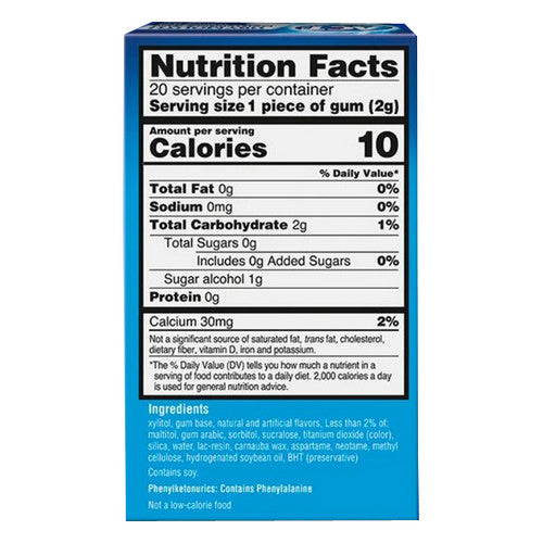 | Ingredients: Serving Size: 1 Piece (2 g); Calories 10; Total Fat 0 g (0% Daily Value); Sodium 0 mg (0% DV) Total Carbohydrate 2 g (1% DV) (Total Sugars 0 g [Includes 0 g Added Sugars, 0% DV]); Protein 0 g; Xylitol; Gum Base; Natural and Artificial Flavors; Less than 2% of: Maltitol; Gum Arabic; Sorbitol; Sucrose; Titanium Dioxide (Color); Silica; Water; Resinous Glaze; Carnauba Wax; Aspartame; Neotame; Methocel; Hydrogenated Soybean Oil; BHT |