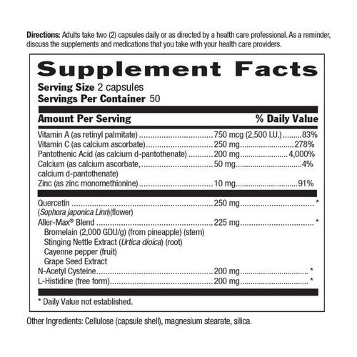 Vitamin A(as Retinyl palmiltate),Vitamin C(as Calcium ascorbate),Pantothenic acid (as d-calcium pantothenate),Zinc(as zinc monomethionine),Quercetin(From Sophorae Japonica linn)(flower),N-Acetyl Cysteine,L-Histidine(free Form),Bromelain(2,000 GDU/g)(from Pineapple),Stinging nettle(Urtica dioica)(leaf),cayenne(fruit),Grape seed extract(95% polyphenols equal to 4.75 mg)