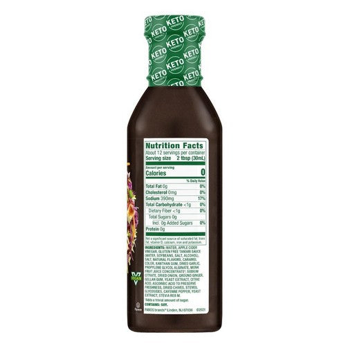 | Ingredients: Water, Organic Apple Cider Vinegar, Gluten Free Tamari Sauce (Water, Soybeans, Salt, Alcohol), Salt, Tragacanth Gum, Natural Flavors, Caramel Color, Dried Garlic, Monk Fruit Juice Concentrate†, Dried Onion, Gellan Gum, Ground Ginger, Yeast Extract, Xanthan Gum, Ascorbic Acid to Preserve Freshness, Citric Acid, Dried Chives, Steviol Glycosides, Cayenne Pepper, Stevia Reb M. | ||