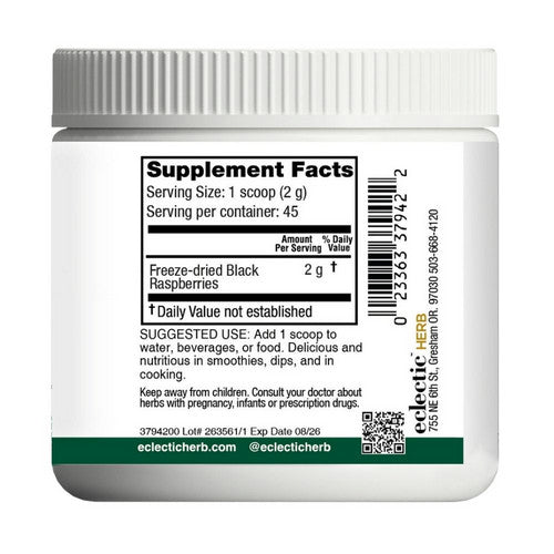 Fresh, FREEZE-DRIED, whole black raspberry fruit, including seeds. The whole berries are freeze-dried, then ground into a fine powder for bioavailability and ease of mixing. For comparison purposes, one teaspoon of black raspberry powder is approximately equal to six 300 mg capsules.