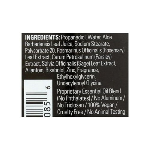 | Ingredients: Propanediol, Water, Aloe Barbadensis Leaf Juice, Sodium Stearate, Polysorbate 20, Ethylhexylglycerin, Rosmarinus Officinalis (Rosemary) Leaf Extract, Carum Petroselinum (Parsley) Extract, Salvia Officinalis (Sage) Leaf Extract, Allantoin, Zinc, Fragrance, Bisabolol. |