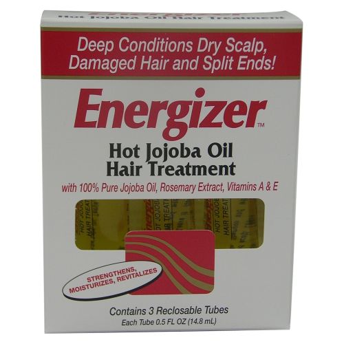 Deep conditions dry scalp, damaged hair and split ends! Strengthen, moisturizes, revitalizes. Contains 3 reclosable tubes. Jojoba Oil has been used for centuries as a deep moisturizer for hair and scalp. Energizer Hot Jojoba Oil Hair Treatment opens up the hair cuticle to lightly coat each imbrications on the hair shaft and penetrates the sebum build-up on the scalp to moisturize the follicle openings in the dermal layer. Rosemary extract provides a volatile oil stimulant that draws blood circulation to the scalp and hair follicles, thus strengthening and revitalizing the hair. Vitamins A and E nourish each strand of fine, dry, brittle or over-processed hair with antioxidant protection. U.S.D.A. Research indicates that Jojoba Oil, when used in sufficient quantities, promotes a luxurious growth of healthy hair.