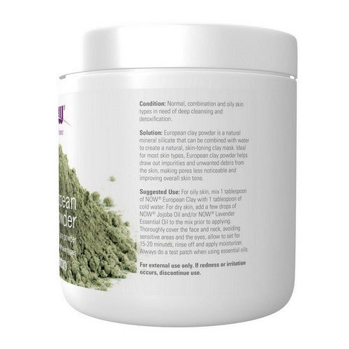 For oily skin, mix 1 tablespoon of NOW� European Clay with 1 tablespoon of cold water. For dry skin, add a few drops of NOW� Jojoba Oil and/or NOW� Lavender Essential Oil to the mix prior to applying. Thoroughly cover the face and neck, avoiding sensitive areas and the eyes, allow to set for 10-20 minutes, rinse off and apply moisturizer. Always do a test patch when using essential oils.