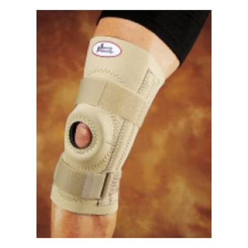 - 1/8 inch neoprene support with adjustable horseshoe-buttress or sewn-in tubular buttress to accommodate patellar instabilities