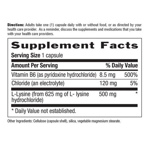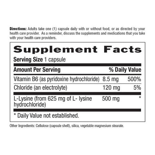 L-Lysine is an essential amino acid that supports the structure and function of collagen that is found in skin tissue.** It promotes collagen renewal in particular in the lips and mouth. **Uses vitamin B6 to aid in utilization.**
