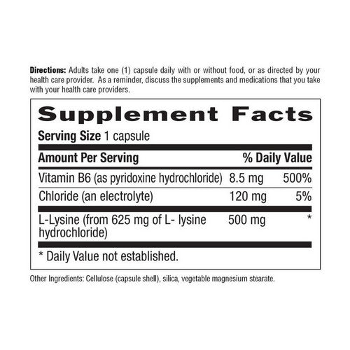L-Lysine is an essential amino acid that supports the structure and function of collagen that is found in skin tissue.** It promotes collagen renewal in particular in the lips and mouth. **Uses vitamin B6 to aid in utilization.**