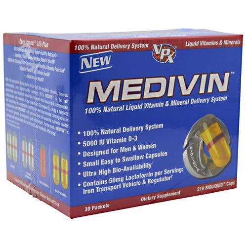 100% Natural Liquid Vitamin & Mineral Delivery System. 5000 IU Vitamin D-3. Designed for Men & Women. Small Easy to Swallow Capsules. Ultra High Bio-Availability. Contains 50mg Lactoferrin per Serving: Iron Transport Vehicle & Regulator. Liquid Vitamins & Minerals. Medivin has been scientifically formulated to be the cream of the crop of multivitamin supplements. Not only will you receive all the essential vitamins and minerals, but you'll get the benefits of omega 3 fatty acids, Lutein, and antioxidants. Also, Medivin contains the synergistic combination of vitamins E,C, as well as calcium. This trio of nutrients has several outstanding characteristics specifically designed to help you recover from your workout and reduce body fat. Research has proven that regardless of whether you're doing a short bout of intense exercise or an ultra marathon, your body's antioxidant defenses may be compromised. In distance runners, vitamin E significantly reduced the markers of muscle injury following six successive days of endurance running. Another study found that vitamin C supplementation had beneficial effects on muscle soreness and muscle function post exercise. And to top it off, research shows that the calcium in Medivin may assist in fat loss. Consuming the right nutrients for optimal health and fitness is one thing. However, nutrient utilization is another. Unlike most brands, the nutrients in Medivin are encased in super virgin oils that aid in maximum nutrient absorption and duration of action. This represents a quantum leap over pressed tablets. Remember, minerals + heat + pressure = a rock. That's why some other vitamin and mineral brands have shown to have just 0-4% absorption. Conversely, Medivin has shown in dissolution studies to have a super high absorption rate of 84% to 97%! Medivin not only contains the most scientific and synergistic combination of micronutrients you need, but it also delivers them to the body so they can be utilized more effectively. The New BioLiquid Medivin innovation packs a nutrient dense punch in one convenient packet. 34 Vitamins, Minerals & Super-Healthy Nutrients. Omega 3 Fatty Acids for Good Mood & Health. 5000 IU Vitamin D for Cardiovascular Health & Muscle Function. Vitamin E and C for Cellular Health. Lutein for Eye Health. With its synergistic liquid blend of 34 high bio-available vitamins, minerals, antioxidants, and super-healthy nutrients VPX's Medivin is the next generation super-nutrient innovation. Research has shown that micronutrient deficiencies are prevalent in our population. Consequently, eating a balanced diet consisting of lean protein, healthy fats and unprocessed carbohydrates in combination with Medivin will give your body the essential nutrients needed for normal growth, development and metabolism. Furthermore, Medivin is packed with antioxidants for total health and metabolic efficiency. Gluten free.