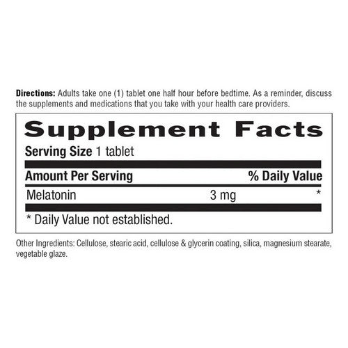 Suggestions Directions: Adults take one tablet one half hour before bedtime. As a reminder, discuss the supplements and medications that you take with your health care providers. Special Note Free OF: Non GMO, Gluten. Warnings If you are pregnant or nursing, taking medication or planning a surgery, consult your doctor before using this product. If any adverse reactions occur, stop taking the product and consult your doctor. Do not accept if seal is broken. Store between 59º-86ºF. Keep out of the reach of children. | ||