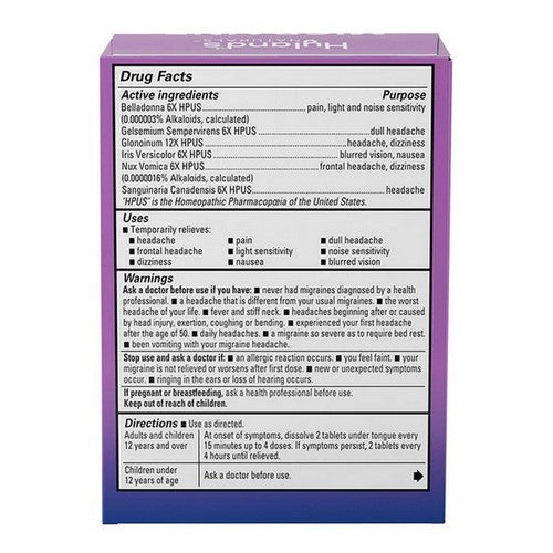 Ask a doctor before use if you have never had migraines diagnosed by a healthprofessional. A headache that is different from your usual migraines. The worst headache of your life. Fever and stiff neck. Headaches beginning after or caused by head injury, exertion, coughing or bending. Experienced your first headache after the age of 50. Daily headaches. A migraine so severe as to require bed rest. Been vomiting with your migraine headache. Stop use and ask a doctor if: an allergic reaction occurs. you feel faint. Your migraine is not relieved or worsens after first dose. New or unexpected symptoms occur. Ringing in the ears or loss of hearing occurs. If pregnant or breastfeeding, ask a health professional before use. Keep out of reach of children.