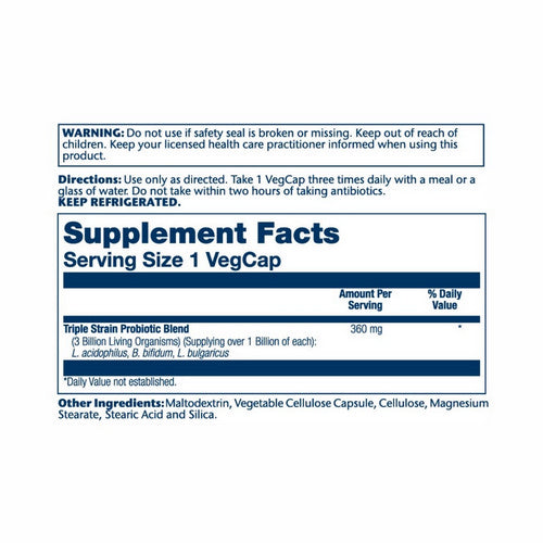 Use only as directed. Take one VegCap three times daily with a meal or a glass of water. Do not take within two hours of taking antibiotics. Keep refrigerated.