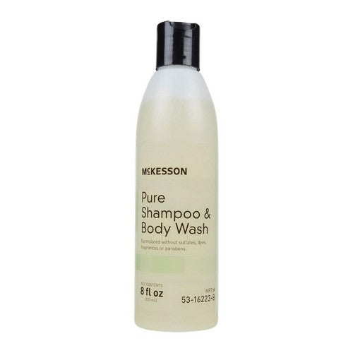 McKesson Pure Shampoo & Body Wash. 8 oz (237 mL). Formulated without sulfates, dyes, fragrances, or parabens. Designed to gently cleanse the entire body from head to toe. Removes build up from conditioners, hair sprays and other hair care products. Leaves skin feeling touchably soft and smooth. For daily use, all hair types, color treated or permed hair. Cleans hair, scalp and body. Removes scales of dandruff and controls oil. Not Made with Natural Rubber Latex.. Packaged: 48 Per Case.