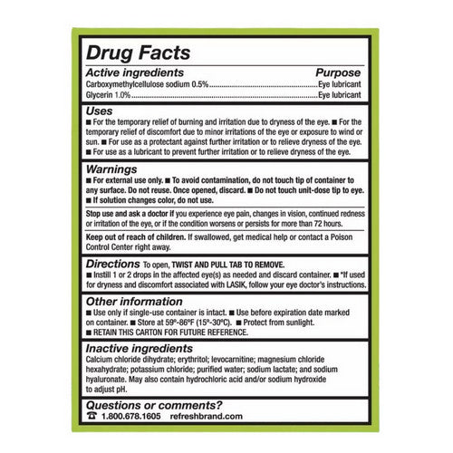 For the temporary relief of burning and irritation due to dryness of the eye. For the temporary relief of discomfort due to minor irritations of the eye or exposure to wind or sun. For use as a protectant against further irritation or to relieve dryness of the eye. For use as a lubricant to prevent further irritation or to relieve dryness of the eye. Relieves dryness associated with LASIK. The preservative-free formula comes in a patented, multidose bottle with a double lockout system that keeps drops sterile.