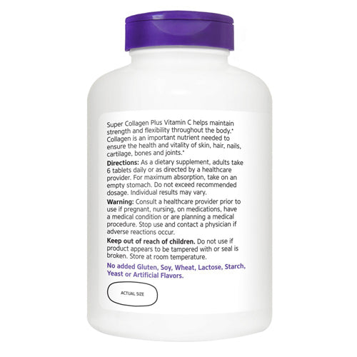 Super collagen plus vitamin c helps maintain strength and flexibility throughout the body. Collagen is an important nutrient needed to ensure the health and vitality of skin, hair, nails, cartilage, bones and joints.