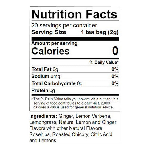 | Other Ingredients: Ginger, Lemon Verbena, Lemongrass, Natural Lemon and Ginger Flavors with other Natural Flavors, Rosehips, Roasted Chicory, Citric Acid and Lemons. | ||