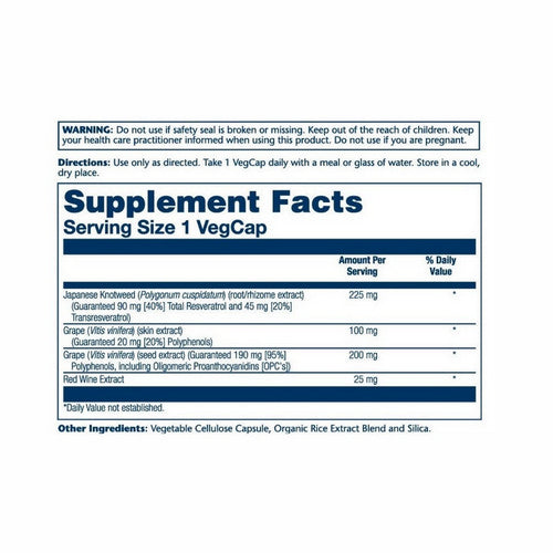 | Grape (Vitis vinifera) (skin extract) (Guaranteed 20 mg [20%] Polyphenols) | 100 mg | * |