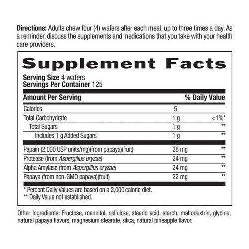 Suggestions Directios: Adults chew four (4) wafers after each meal, up to three times a day. As a reminder, discuss the supplements and medications that you take with your health care providers. Special Note Free Of: Gluten, Vegan. Warnings If you are pregnant, nursing, or taking medication, have a medical condition or planning surgery, consult a doctor before using this product. Stop using and consult a doctor if any adverse reactions occur. Do not accept if seal is broken. Store in a dry place between 59°-86°F. Keep out of the reach of children. | ||