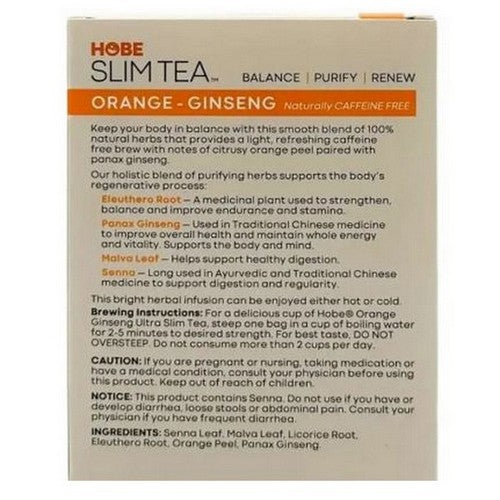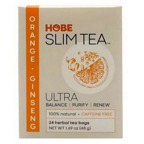 Hobe Labs Ultra Slim Tea, Orange Spice. Delicious herbal formula. With Balanced Diet Plan, The Orange Spice Ultra Slim Tea blend of 100% natural herbs provides a light, delicious caffeine free beverage that helps achieve results in aiding digestion and contributing to weight loss. Orange Spice Ultra Slim Tea gently assists the digestive system by stimulating peristaltic action of the intestinal tract. Mild lubricating herbs encourage elimination of excess waste and toxins...without the discomfort of cramps of diarrhea. Each box of Orange Spice Ultra Slim Tea, includes a Balanced Diet Plan with delicious meal suggestions. These nutritious meal planning tips, used with Ultra Slim Tea, provide healthy natural alternative to inconvenient and expensive low calorie and difficult to maintain diet programs. Drink delicious, slimming orange spice ultra slim tea hot or cold... and see the results! Begin drinking Ultra Slim Tea at half strength by diluting with water and reducing the steeping tim